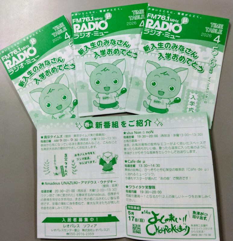 2026年4月5月6月号タイムテーブルを新川地区の公共施設(市役所・町役場・コラーレ)などに置かせていただいています。